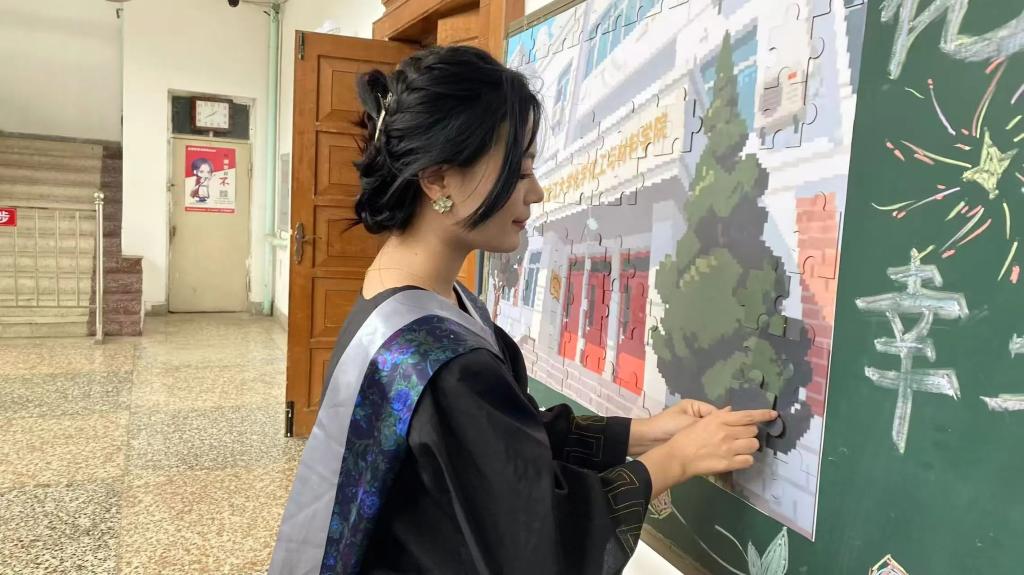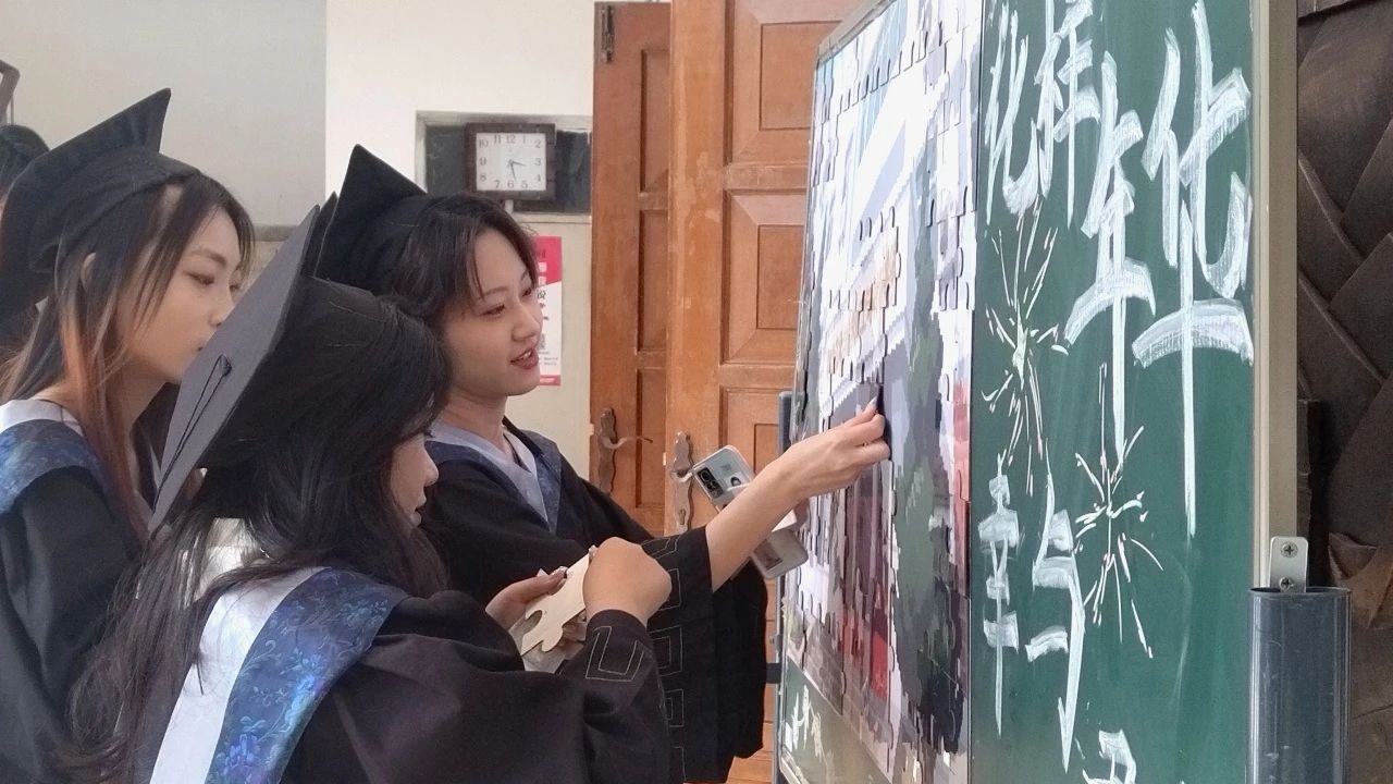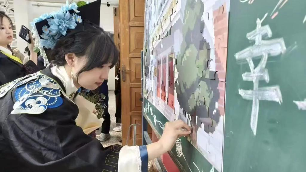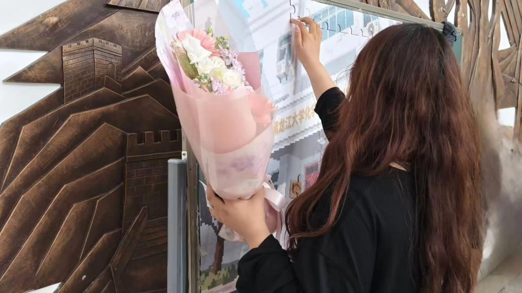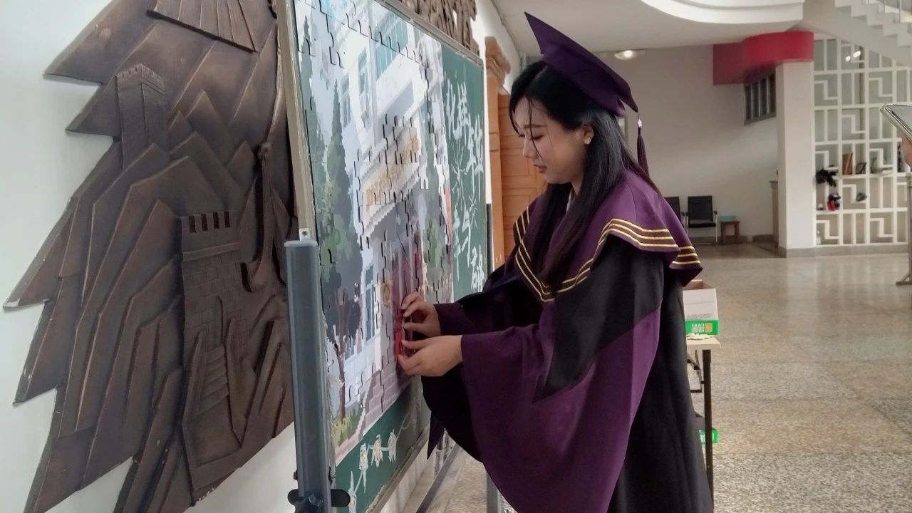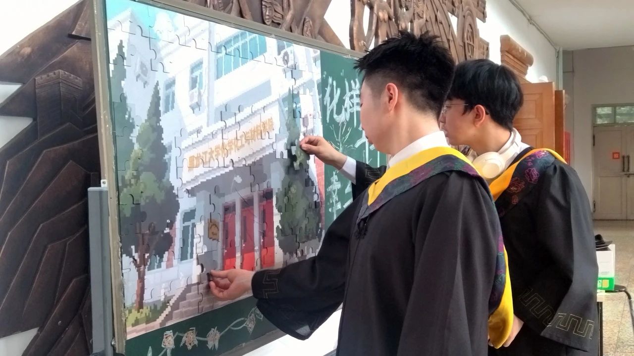 在毕业典礼开始前和结束后,2025届本硕博毕业生踊跃参与拼图活动,每一块碎片,都是青春的注脚;每一次拼接,都是与回忆的重逢。大家怀着对学院的深厚情感,将碎片逐一拼接,共同还原出化学楼的完整模样,拼凑出属于他们的青春岁月。