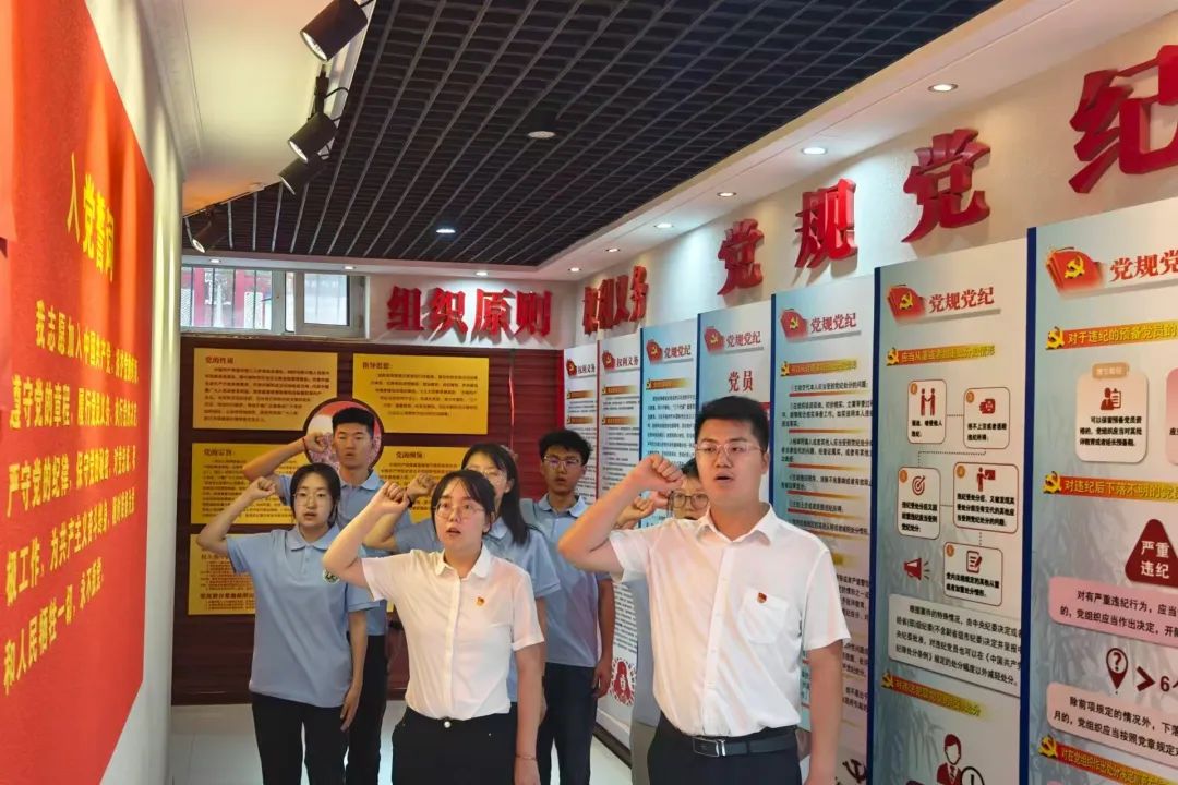 接着,党员们重温入党誓词。全体党员面向鲜红的党旗,高举右拳,庄严宣誓,铿锵有力的誓言饱含着对党的无限忠诚和为共产主义事业奋斗终身的坚定信念,强化了党员的身份意识与使命担当。接下来,全体成员齐声合唱《团结就是力量》,激昂的歌声凝聚着齐心奋进的力量,既传递出对党的深切情感,也彰显了同心同德、携手共进的坚定信念。在熟悉的旋律中,进一步激发了实践队员们团结奋进的精神动力和强烈的集体荣誉感。