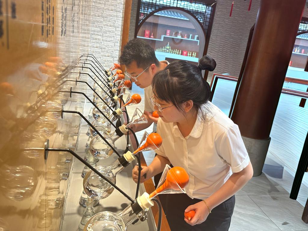 最后,实践队员们在讲解员的引导下,轻嗅白酒馥郁醇香,观摩北大仓酒纯粹的酿酒工艺。从原料处理到发酵蒸馏,每一个环节都体现了守正与创新的平衡,既传承了非物质文化遗产的核心技艺,又融入了创新理念下对品质的精细化管控。北大仓酒的独特风味,是黑土地的慷慨馈赠、匠人的执着坚守与时代的创新精神共同酝酿的成果,既蕴含着历史的厚重感,又彰显着生生不息的活力。