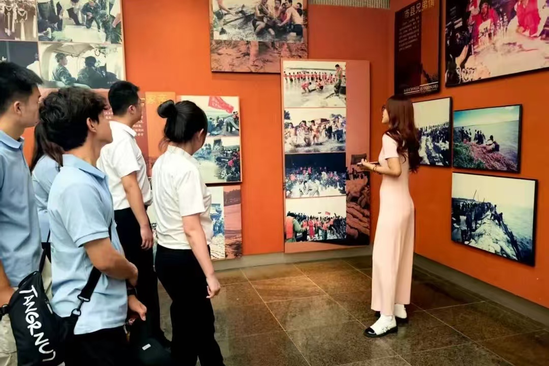实践队员们认真聆听讲解,仔细观看每一件展品。那些斑驳褪色的袖章、字迹渐淡的抗洪日记、记录抢险瞬间的照片,无不生动再现了那段波澜壮阔的抗洪历史。在"红色丰碑"展区,当纪录片重现解放军战士以血肉筑就的"生命堤坝",党员干部纵身跃入激流封堵决口的决然背影画面时,队员们深受震撼,抗洪精神既是历史的生动写照,更是激励新时代青年担当作为的精神力量。纪念馆通过文物陈列、影像还原、场景模拟等多元展示方式,将抗洪精神具象为可触可感的历史见证,使这段珍贵的历史记忆升华为指引新时代前进方向的精神坐标。