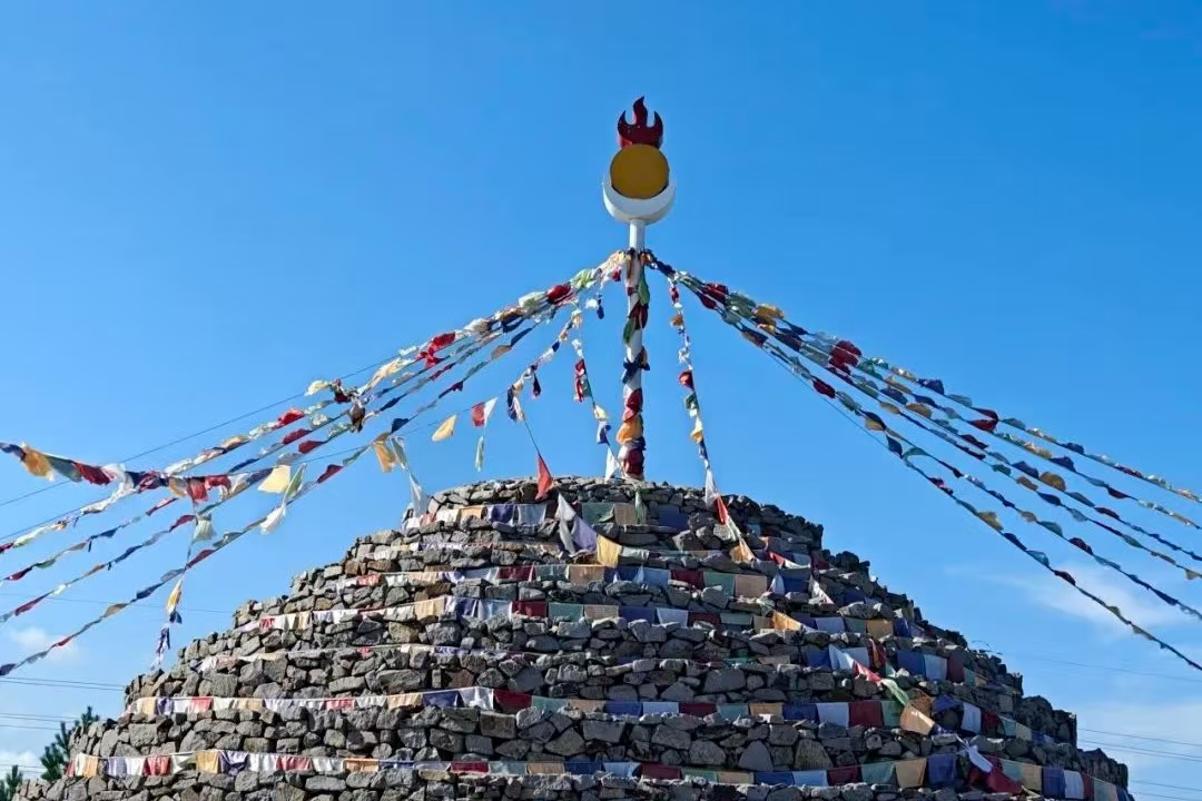 最后,实践队员们来到巴彦查干敖包,通过当地人的讲解,实践队员们深刻认识到,敖包不仅是草原上的地理标志,更是游牧文明的精神图腾。它凝结着历史的记忆,承载着族群的信仰。每一块垒石都铭刻着先民的智慧历史,每一条缠绕的哈达都延续着千年的礼赞。这一刻,实践队员们在敖包前感受到的不仅是这片土地的神秘,更是一场跨越古今的心灵对话。