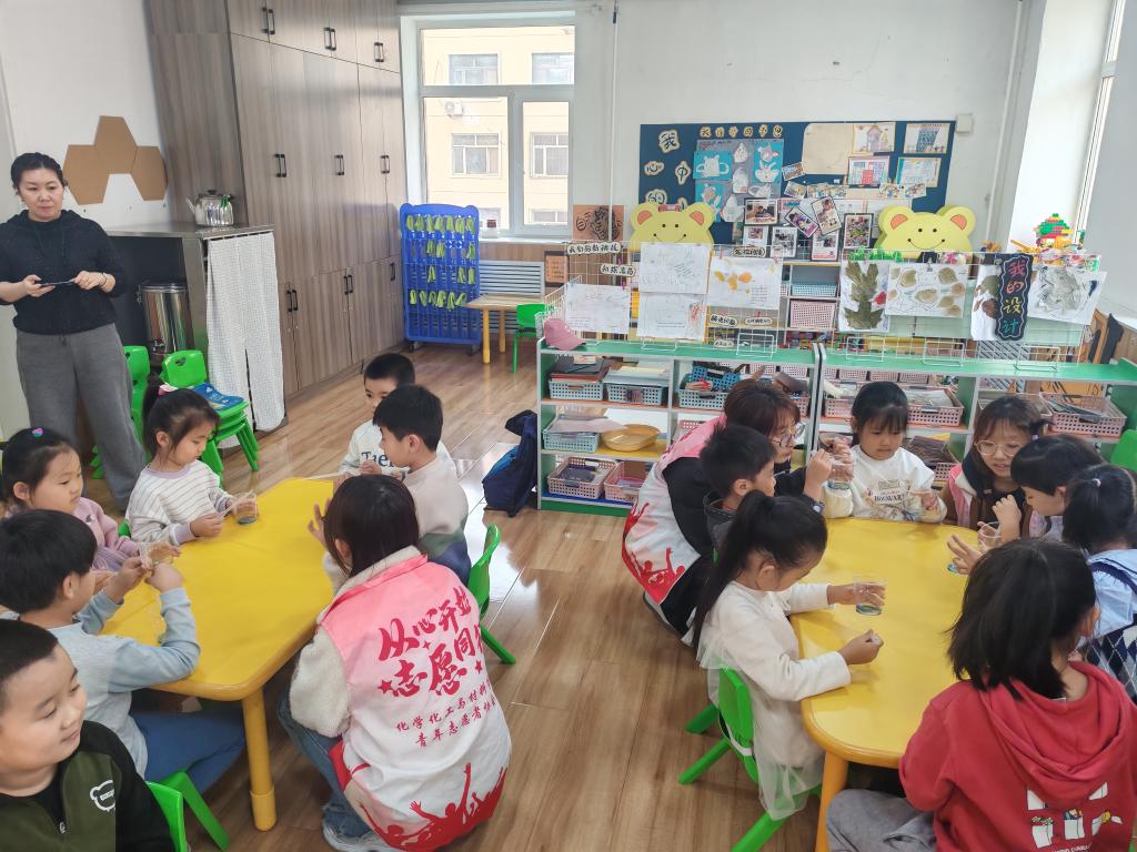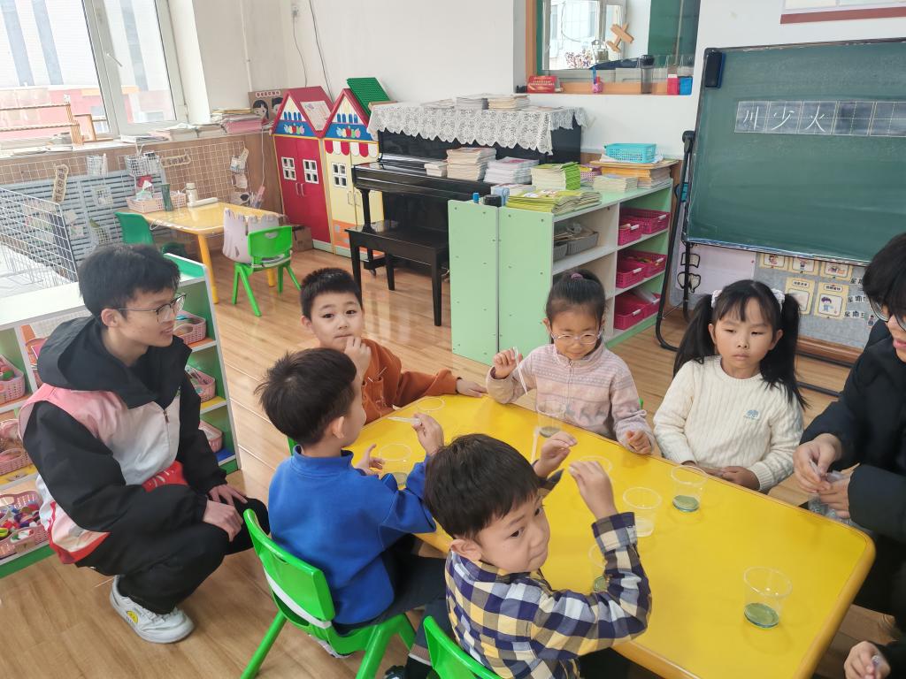 紧接着,志愿者们带来食盐溶解小实验,将食盐缓缓倒入清水中并不断搅拌,白色的食盐颗粒逐渐“消失”在水中。志愿者用贴近幼儿认知的童趣语言引导孩子们观察现象,无需讲解复杂原理,让孩子们在“变魔术”般的体验中理解溶解的概念,感受生活中化学知识的无处不在。全程志愿者们面带微笑、耐心引导,用温柔的互动陪伴孩子们探索科学奥秘,充分调动起孩子们的好奇心与求知欲。