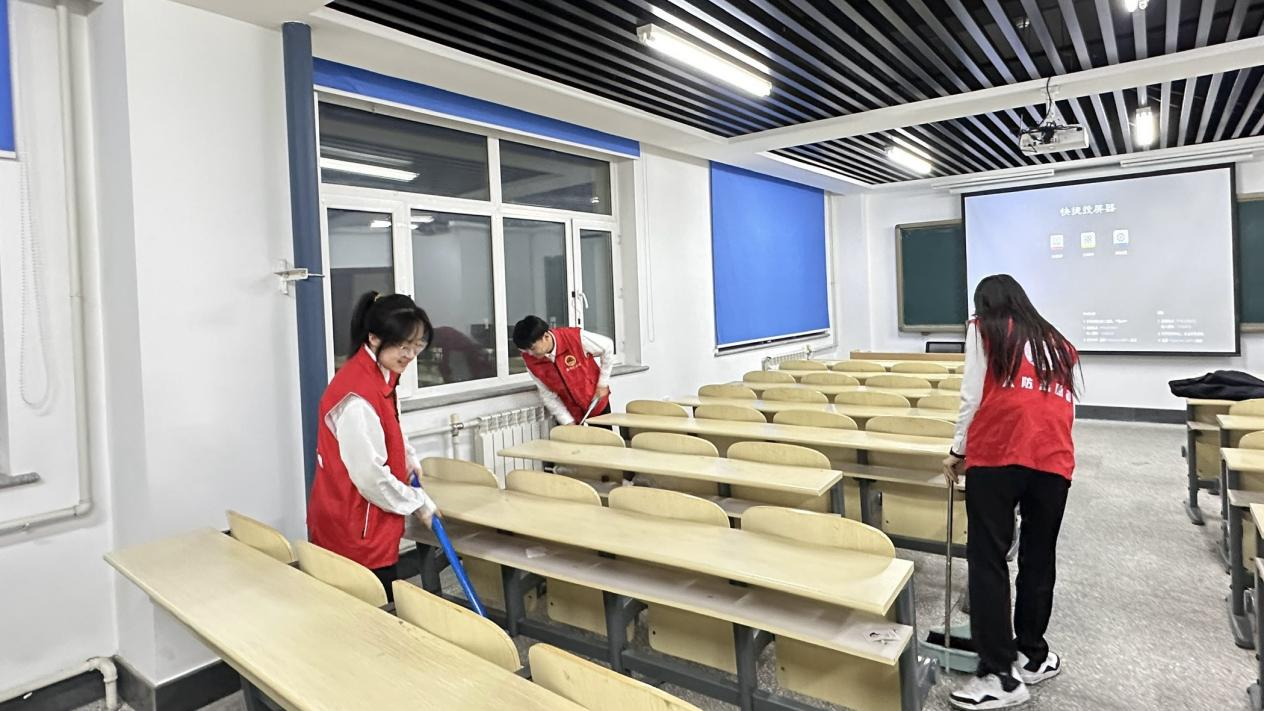 在实践促学环节,培训班学员在实训楼教室进行志愿清扫实践教学,大家聚焦“我为师生做贡献”,在志愿服务的生动实践中提升自我,磨炼自身意志品质,领悟以实践促学的真谛。