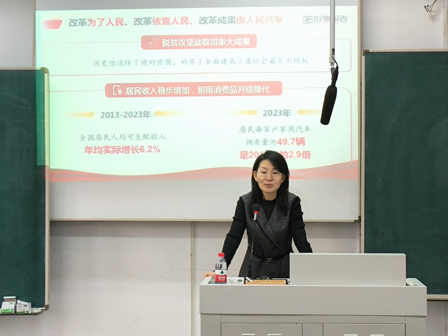 课堂上,两位老师总结了党带领中国人民争取民族独立和民族解放征程中的宝贵经验,介绍了新时代全面深化改革取得的历史性伟大成就与党的二十届三中全会召开的重要作用和重大意义。两位老师强调:改革没有完成时,改革开放是当代中国大踏步赶上时代的重要法宝,是决定中国式现代化成败的关键一招,需围绕党的中心任务谋划,坚持把改革总目标同党的中心任务结合起来,向着实现全面深化改革总目标不断迈进。