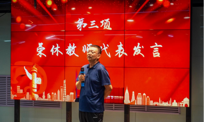 随后,荣休教师代表赵东宇发言。回望执教岁月,他亲眼见证了学院团队队伍日渐壮大、科研平台持续升级、学术成果不断涌现的跨越式发展历程。与学院共成长的岁月,让他对这份事业满怀深情。他向青年教师寄予厚望,叮嘱他们接好教育“接力棒”,以赤诚坚守育人初心,用创新活力为学院发展注入新动能,最后衷心祝愿学院能够续写荣光、再攀高峰。