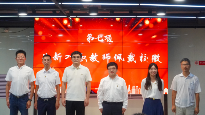 在新教师入职仪式环节,工会委员程晓丽宣读2024-2025年度新入职教师名单。化学系主任邓兆鹏、化学工程与工艺系主任肖林飞为新入职教师佩戴校徽。