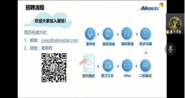 在本次的专场招聘宣讲会中,董秀丽经理主要介绍公司的理念、主营业务、产品市场占有率等信息,天津爱旭太阳能科技有限公司不断研发新技术开发新产品,持续为客户提供”更高效率、更低成本、更多发电量“的电池,拥有业内领先的PERC电池制造技术和生产供应能力,是全球PERC电池的主要供应商之一,深受全球晶硅组件企业的青睐。并详细介绍了公司职员培养和发展方向,毕业生入职会成为入职管培生,继而成为助理工程师或专员然后分为两类:管理岗或技术专业岗,通过测试和培训晋升岗位。