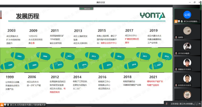 会议伊始,张女士从公司概况、核心竞争力、厂房风采、技术创新等方面对永太科技股份有限公司进行了详细介绍。公司产业主要分布于沿海地区,并拥有垂直一体化的产业链、柔性化的综合生产平台和专业化的研发创新团队,主要为国内外客户提供定制研发、生产及技术服务业务。张女士表示公司将以全球化架构,搭建国际化团队,实现前瞻性视野及世界级研发水平,并发挥氟苯精细化工领先优势,打造医药、农药、新能源材料产业链。
