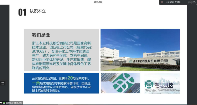 宣讲伊始,江先生从公司概况、发展现状等方面对同学们进行了详细的介绍。浙江本立科技股份有限是一家专注于化工中间体领域,致力医药中间体、农药中间体、新材料中间体的研发、生产和销售的上市企业。企业始终坚持以创新为驱动,针对化工中间体行业应用领域存在的痛点和难点,开发安全、环保和经济的合成工艺以替代传统工艺,是国内专业的专注于清洁生产的化工中间体生产企业。