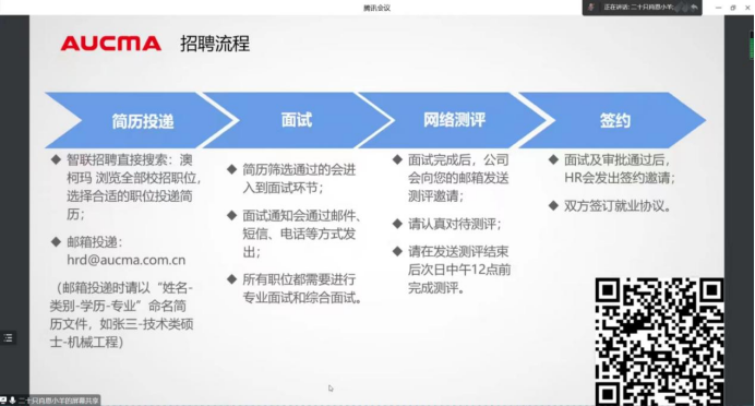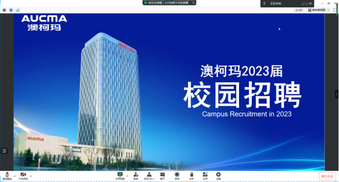 为切实做好公司毕业生就业工作,大力构建毕业生与用人单位,积极为用人单位输送应用型人才。永利3044noc于2022年11月17日16:00举办澳柯玛控股集团有限公司专场招聘会。本次线上招聘会由2023届毕业生辅导员兰瑞、李鸿欣主持,澳柯玛控股集团有限公司人力专员张女士担任主讲,部分2023届毕业生参加。