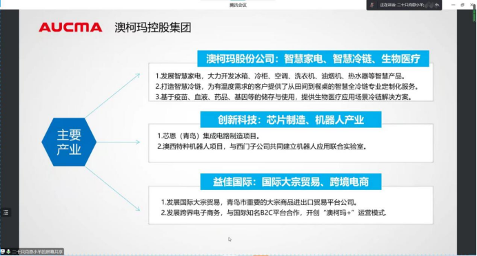 张女士通过短片带领大家沉浸式体验澳柯玛的故事,让同学们初步了解了澳柯玛的基本情况。澳柯玛控股集团是一家集智能化、数字化、国际化于一身的高科技公司。张女士从集成电路、智慧家电、智慧冷链、生物医疗等方面向同学们详细的介绍了集团产业发展情况,澳柯玛以“专业晋升通道、管理晋升通道”的双通道发展任职机制,让业绩突出的研发、质量,业务、销售人员等,从待遇和地位上不被埋没。