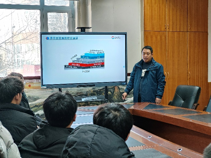 会议伊始,刘经理以企业定位、企业文化、企业发展历程三方面为同学们介绍公司的具体情况,并通过三名老员工的入职案例和公司的文化活动让同学们了解到公司良好的工作、生活环境。他强调老员工要不断的创新,坚持实干,青年的创新力是进步的原动力。随后,刘经理对校园招聘流程、岗位设置、薪资待遇、晋升空间、企业培养体系以及五险一金等方面作了详细介绍。