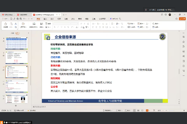 沈庆新老师鼓励毕业生积极拓展就业思路,多方面寻找就业机会,强调同学们应充分发挥自我优势,了解当前就业情况,并对近期的各省份公务员、选调生、事业单位报考信息进行了梳理和政策讲解。他强调,各位同学及家长应该抓住寒假时期,以“底子清、方法正”的就业工作理念,合理利用家校资源,丰富就业信息平台,寻找就业的最优环境。