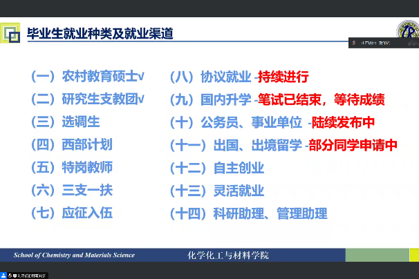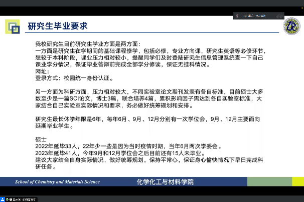 随后,蒋帅老师对研究生毕业要求进行简要概述,以往届研究生就业率和研究生就业方向为基点,从升学、公考及事业单位、企业去向等方面为家长与同学们分析专业优势、择业热点等内容,帮助同学们及家长拓宽就业渠道和信息获取方式,明确研究生同学的未来发展概况。