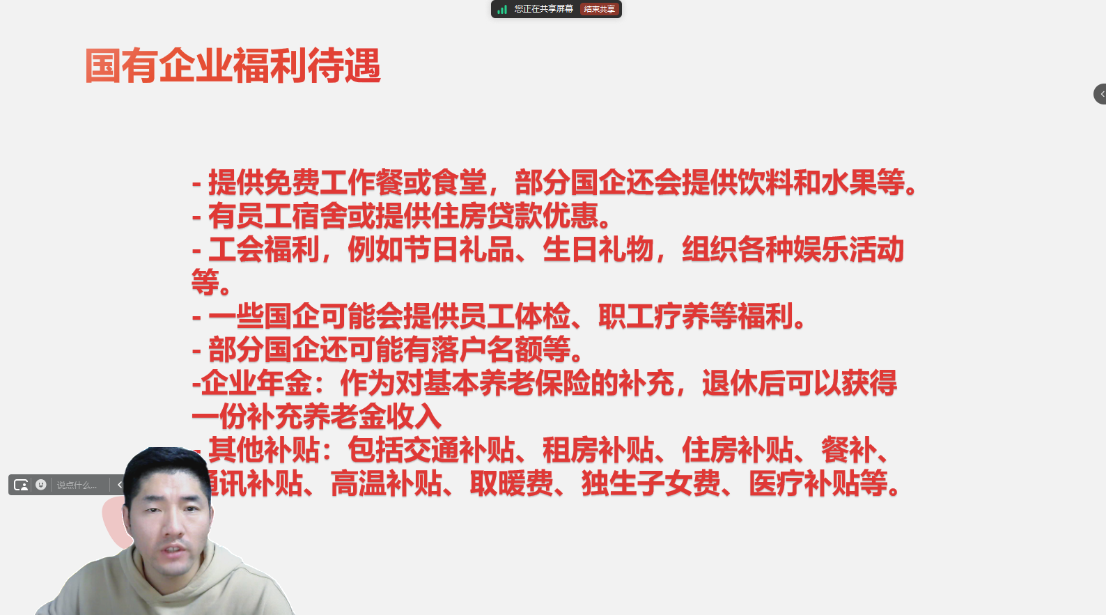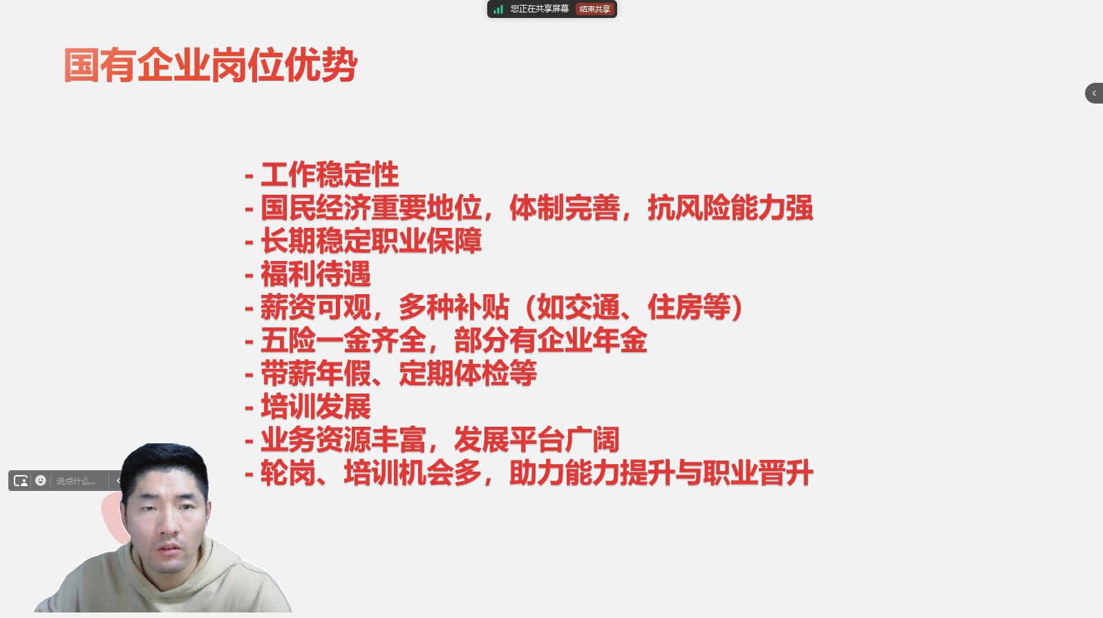 讲座伊始,沈庆新调了当前就业形势下毕业生合理规划职业路径的重要性。随后,沈庆新开始深入剖析国有企业管理职能岗位的情况。在国有企业管理职能岗位方面,沈庆新指出其优势显著。一是工作稳定性强,国有企业在国民经济中占据重要地位,具有完善的体制和雄厚的资源,受经济周期波动影响小,能够为毕业生提供稳定的职业保障。二是福利待遇优厚,不仅有可观的薪资,还包括全面的五险一金、各类补贴、带薪年假、定期体检等,部分国企还有企业年金等额外福利。三是培训与发展体系健全,大型国有企业拥有丰富的业务资源和广阔的发展平台,注重员工的培养与晋升,新入职毕业生可在内部系统中通过轮岗、培训等方式逐步提升能力,拓展职业发展空间。然而,国有企业也存在一定局限性。例如,部分国企可能存在官僚作风和流程繁琐等问题,这可能会对工作效率产生一定影响;同时,国企内部竞争激烈,晋升可能需要按部就班地等待合适时机和满足一定的资历要求。