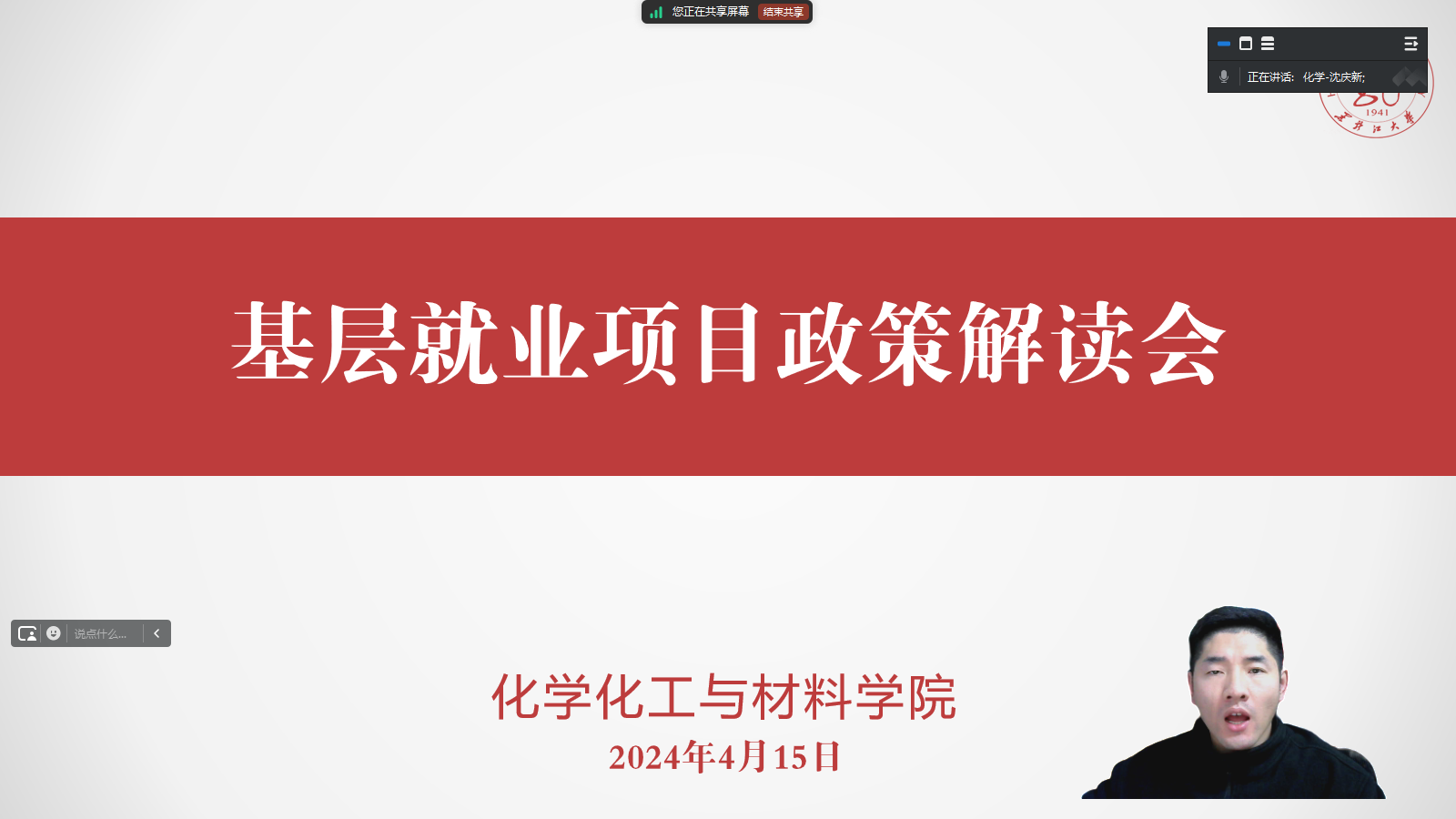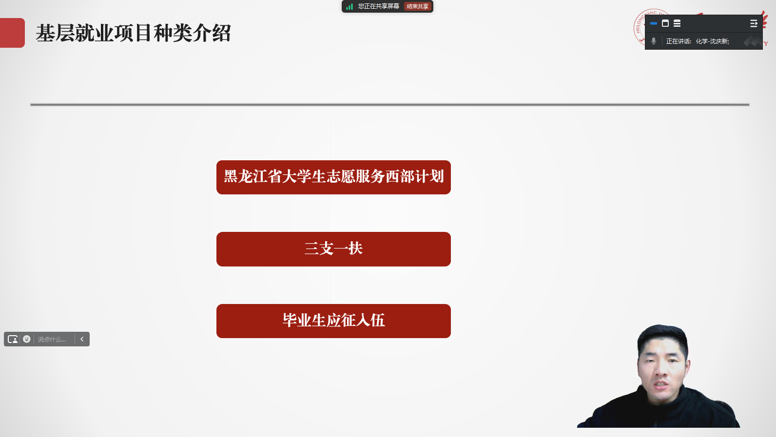 为进一步做好老员工志愿服务西部计划、三支一扶、应征入伍工作,弘扬志愿精神,转变老员工的择业就业观念,引导和动员毕业生到西部去、到基层去、到祖国和人民最需要的地方建功立业,永利3044noc于2024年4月15日线上召开黑龙江省老员工志愿服务西部计划、三支一扶、应征入伍项目解读会,此次会议由2020级辅导员沈庆新主讲,学院部分毕业生参加。