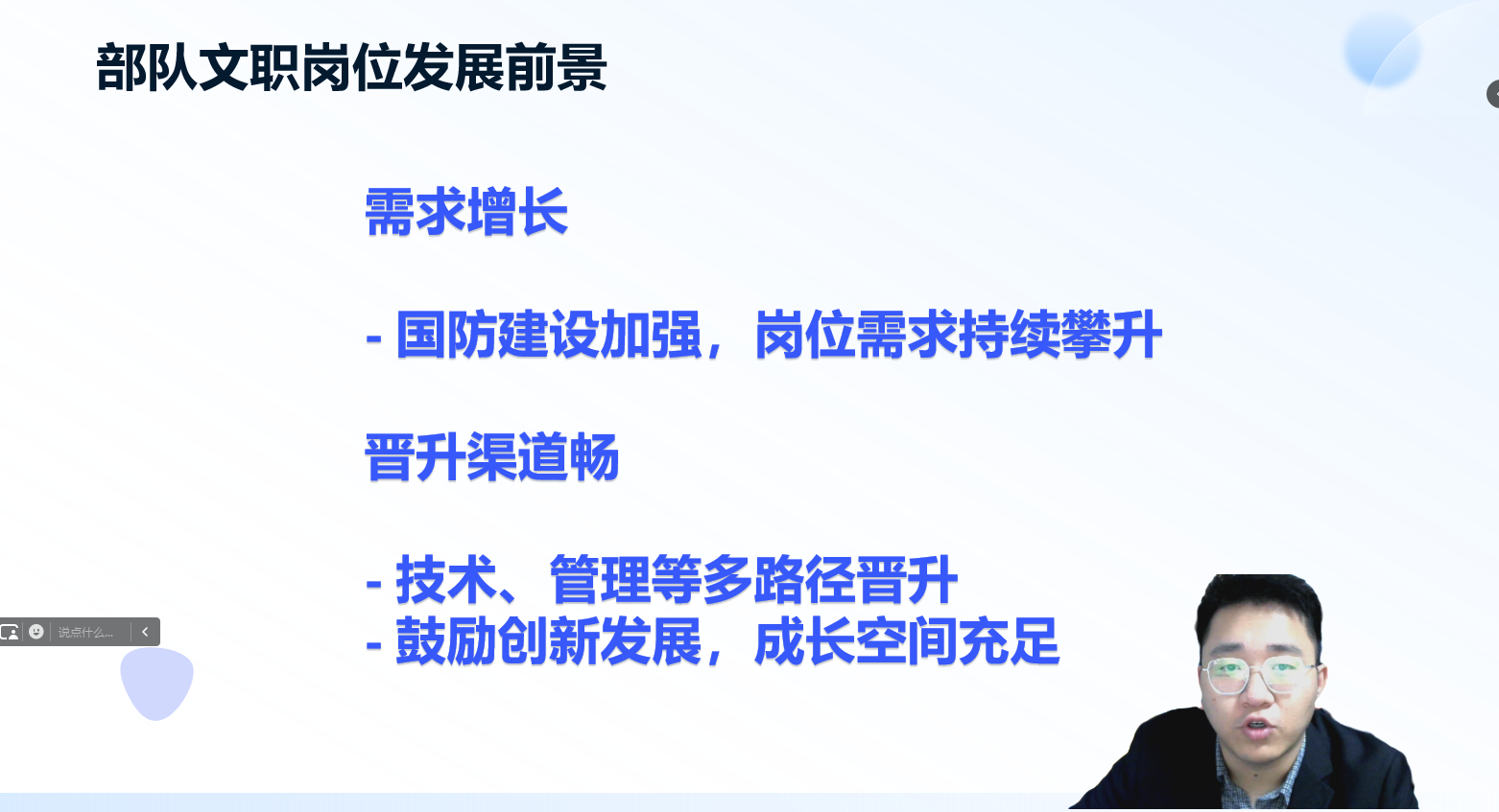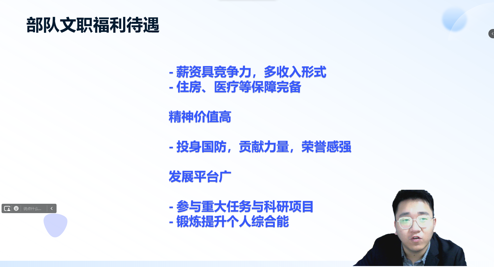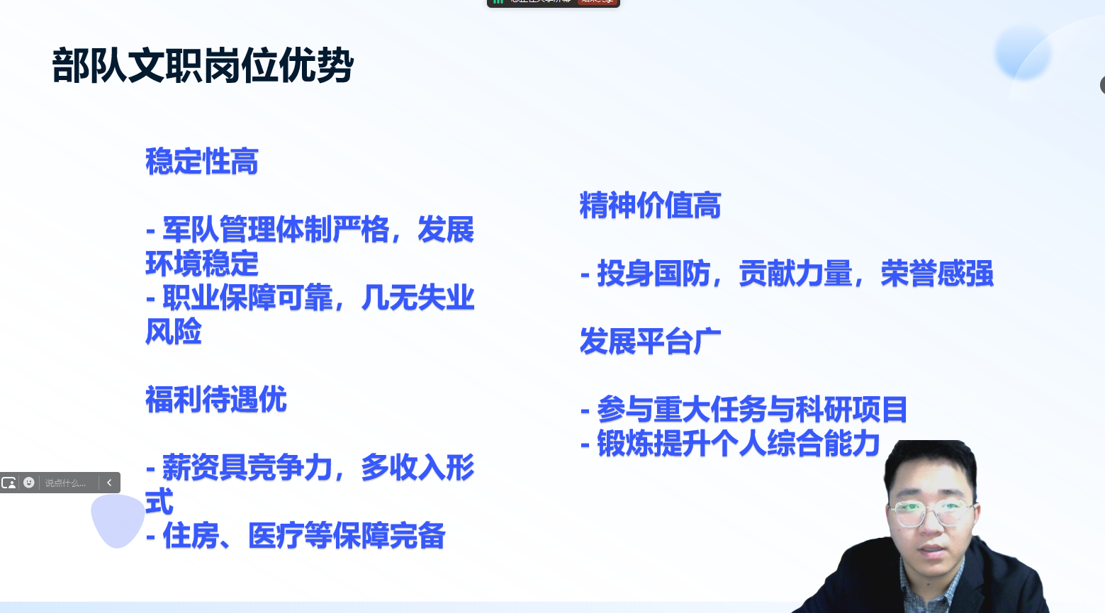 讲座现场气氛热烈,蒋帅出席并强调了多元化就业渠道对于毕业生的重要意义,鼓励同学们积极了解部队文职这一特殊的就业方向。随后,蒋帅开始详细解读部队文职相关政策。在介绍部队文职岗位优势时,蒋帅指出,首先,部队文职工作稳定性极高,军队作为国家的坚强后盾,有着严格的管理体制和稳定的发展环境,为文职人员提供了可靠的职业保障,几乎不存在失业风险。其次,福利待遇优厚,部队文职人员薪资水平在社会中具有较强竞争力,除基本工资外,还有津贴、补贴等多种收入形式,且享受较好的住房保障、医疗保障等福利,让从业者无后顾之忧。再者,部队文职岗位有着独特的荣誉感和使命感,能让从业者投身国防事业,为国家和人民贡献力量,这种精神价值是其他工作难以比拟的。同时,军队拥有丰富的资源和广阔的平台,文职人员有机会参与各类重大军事任务和科研项目,对于个人能力的锻炼和提升效果显著。然而,部队文职岗位也有其特殊的要求和挑战。一方面,军队工作纪律严格,对文职人员的自律性和执行力要求很高,需要适应军事化管理模式,对于自由散漫的个体而言可能是较大的挑战。另一方面,部分部队文职岗位工作地点可能较为偏远或特殊,需要考虑对个人生活的影响;而且军队工作的特殊性可能导致工作压力较大,在执行任务期间可能需要高强度投入。